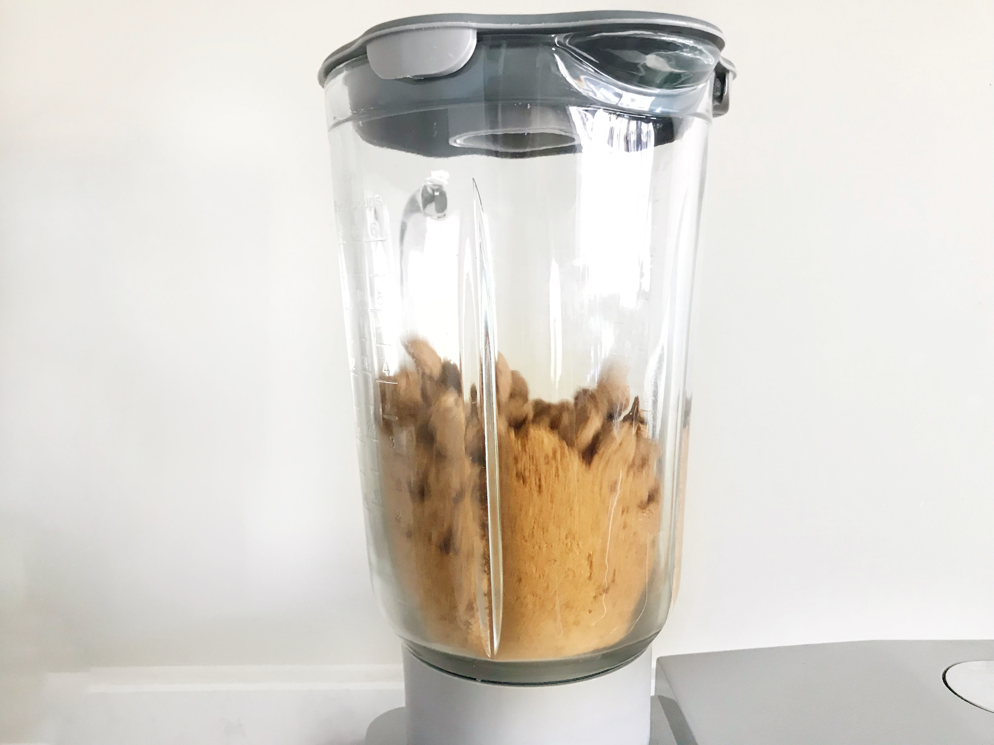 Vervolgens maal ik de kruidnoten fijn. Ik doe dit door ze in een blender te stoppen: de messen malen de kruidnoten nu zo fijn mogelijk. Je kunt er natuurlijk ook voor kiezen om ze met een vijzel fijn te malen, fijn te snijden met een scherp mes of (als je wat agressie kwijt wilt) om ze in een theedoek te doen en er met een pan op te slaan. Als de kruidnoten fijn genoeg zijn stop ik ze in een schaal waarin ik ze kan mixen. De boter smelt ik in een pannetje. Als deze helemaal gesmolten is roer ik de boter door de gemalen kruidnoten. Dit wordt de bodem van de taart. Ik giet het mengsel op de bodem van de bakvorm. Met behulp van een lepel druk ik het plat zodat het een stevige, gelijkmatige bodem wordt. Tenslotte zet ik de springvorm in de koelkast. Na een klein kwartiertje is de boter voldoende gestold en is de bodem hard genoeg geworden om de vulling erop te storten.